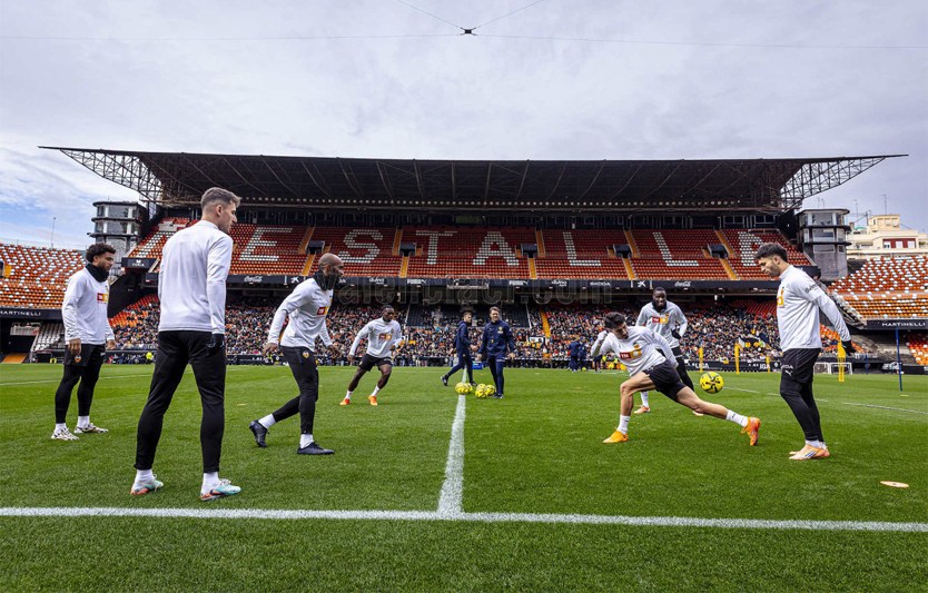 La jornada se convirtió en una auténtica fiesta blanquinegra. Sobre el césped, el conjunto dirigido por Carlos Corberán llevó a cabo ejercicios de activación física, trabajo técnico colectivo y partidillos, enfocados a recuperar sensaciones y preparar el próximo compromiso liguero. Sin embargo, el gran protagonista del entrenamiento fue la afición del Valencia CF, que llenó las gradas del estadio y no dejó de animar durante toda la sesión.