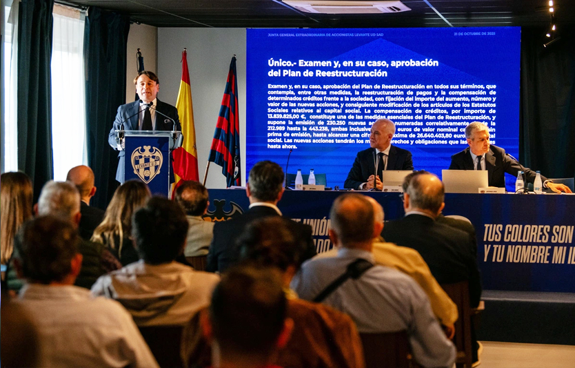 El Levante UD ha aprobado en su Junta General Extraordinaria de Accionistas, celebrada en la nueva sala Paco Fenollosa, el plan de reestructuración de deuda presentado ante el Juzgado de lo Mercantil nº1 de Valencia, marcando un nuevo rumbo financiero para el club. Con un 96,27% de votos a favor, el proyecto recibió luz verde y consolidó a José Danvila como nuevo propietario mayoritario, tras capitalizar 13,8 millones de euros en préstamos, lo que le otorga el 70% del capital social del club granota.