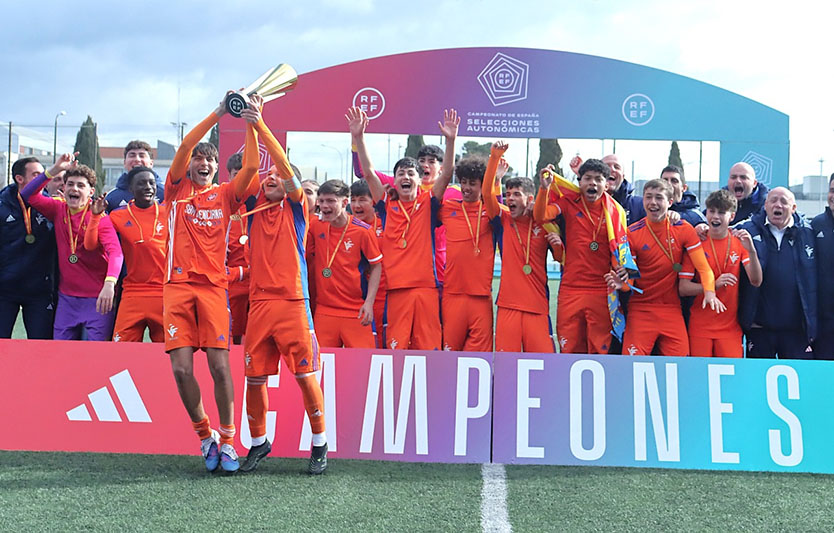 La Selecció Valenciana masculina sub14 se proclamó campeona de España tras imponerse a Catalunya por 0-2 en la final disputada en la Ciudad del Fútbol Aragonés de Zaragoza. El combinado dirigido por Adrián Navarro firmó un torneo impecable y confirmó el excelente momento del fútbol base valenciano.